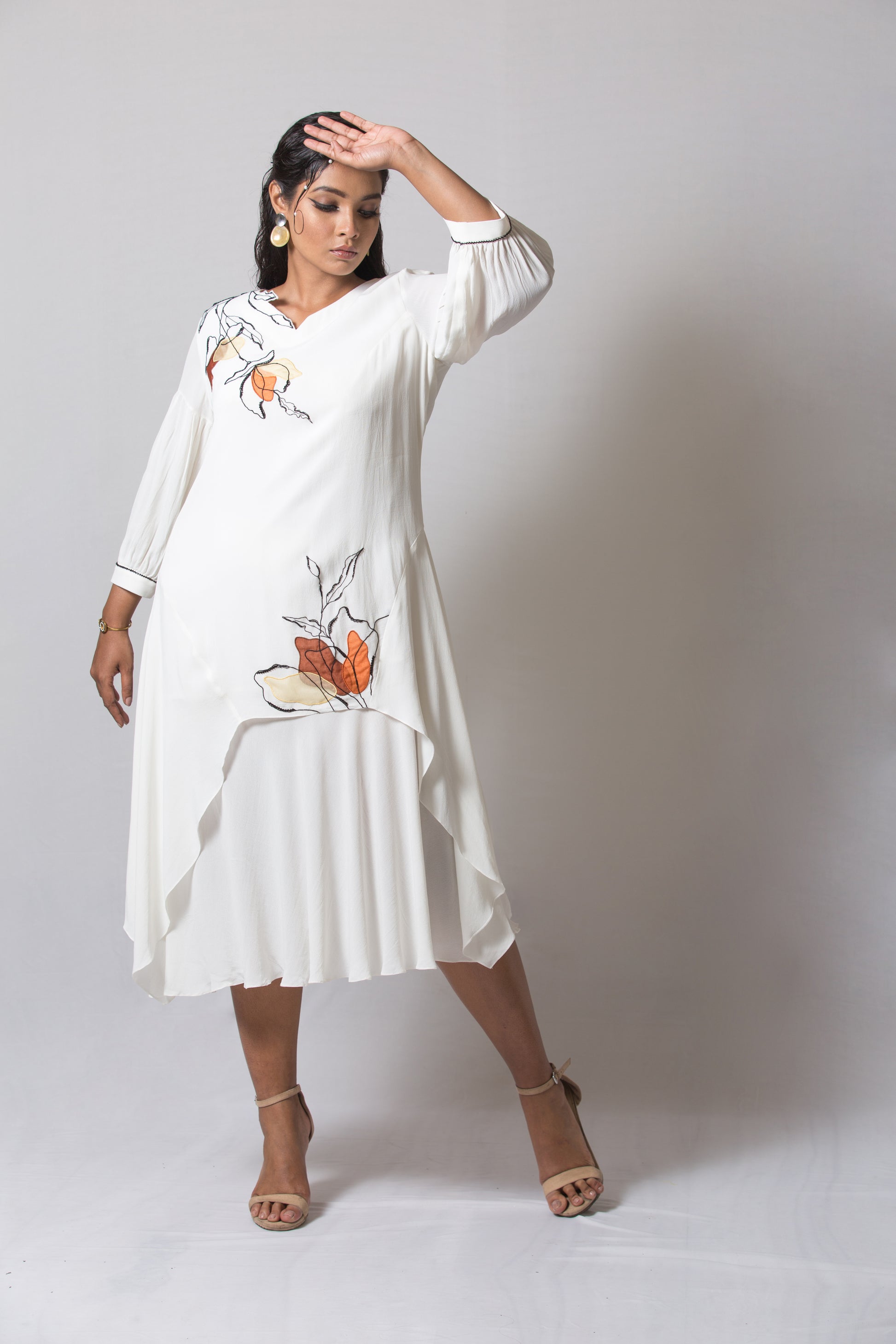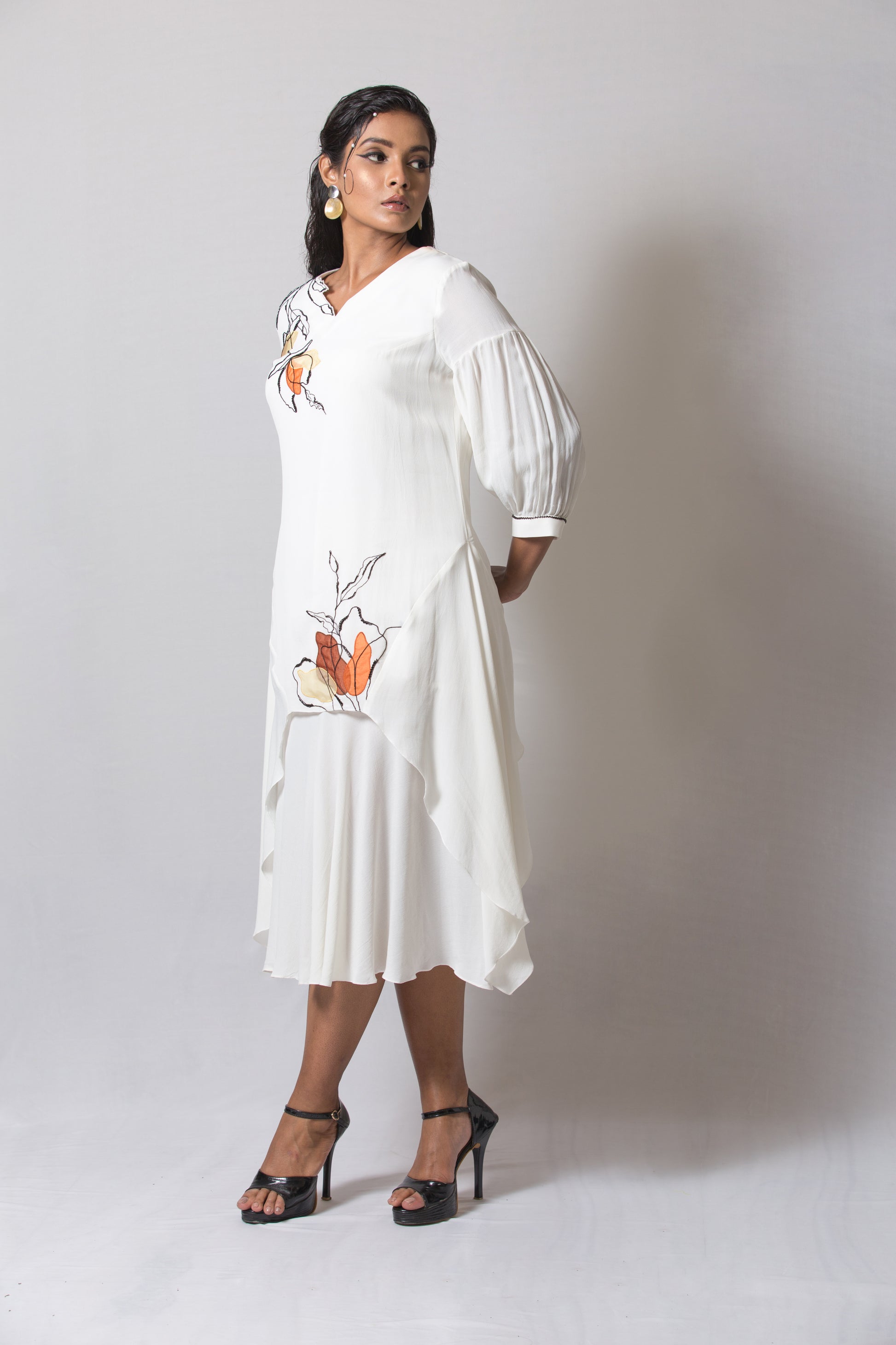 Ivory crepe asymmetric dress with a V-neckline and three-quarter pleated puff sleeves. Detailed with hand-embroidered floral motifs and a layered hemline for a graceful, artistic look.