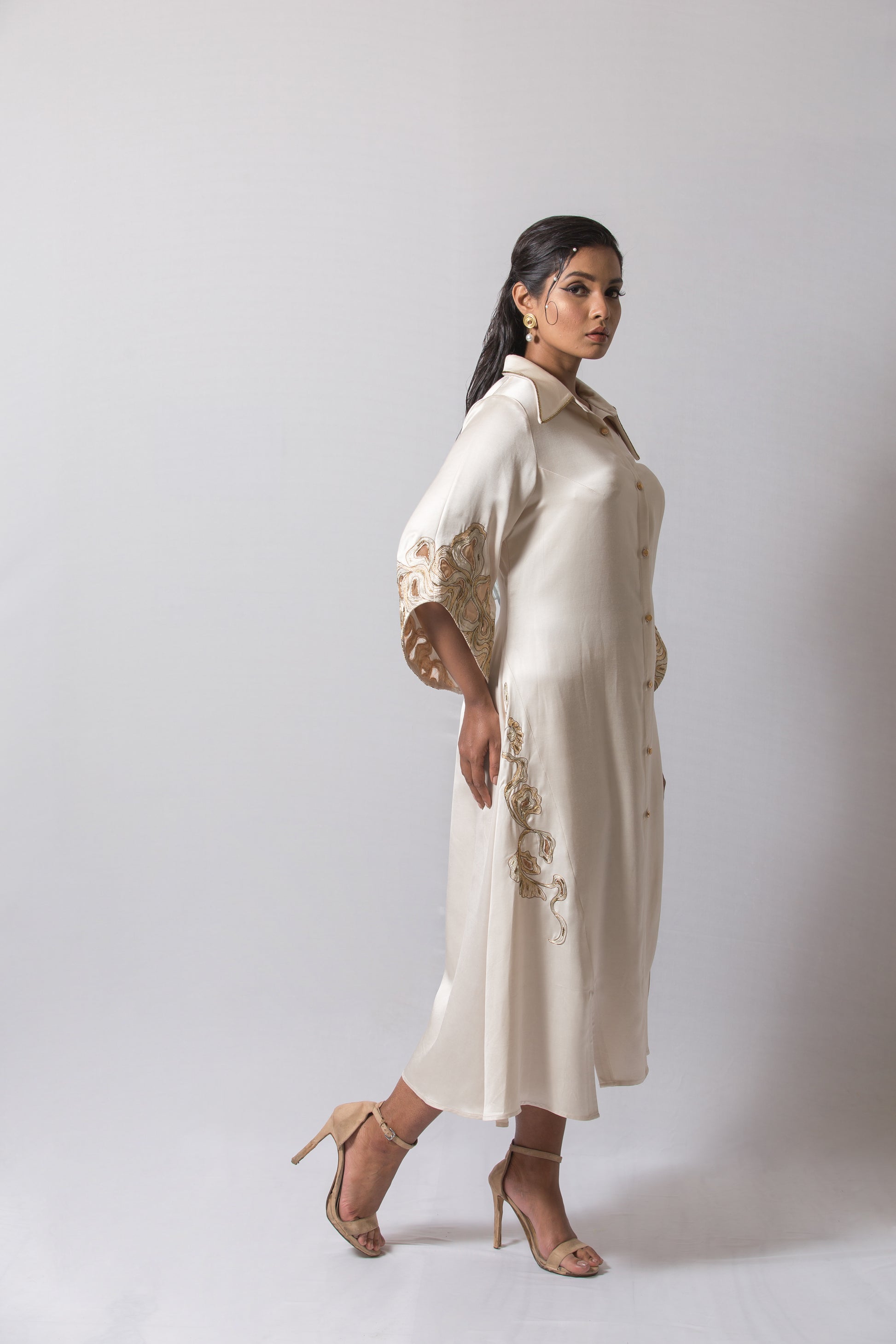 Ivory Mashru satin dress with a straight silhouette, sharp collar, and button-down front. Features wide flared sleeves adorned with intricate embroidery and side slits for ease and style. A graceful balance of timeless elegance and modern sophistication.